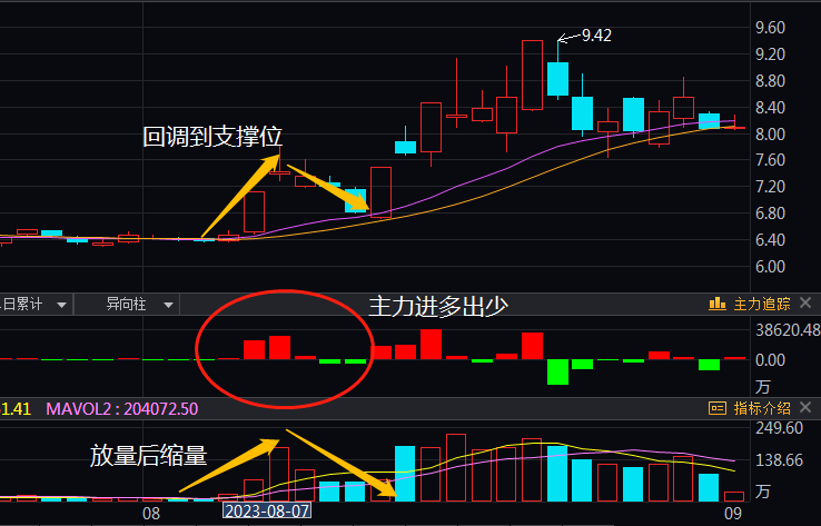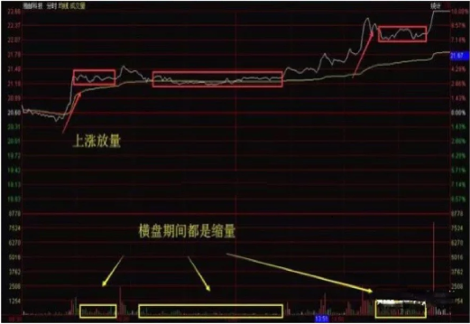 分时图白色、黄色线粘合出现缩量,这样的分时图后续拉升概率就大。