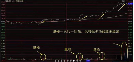 分时图再拉升的时候,会出现连续的红色柱子,一般我们称为攻击量峰,一般股票强势,那么量峰一次比一次高。