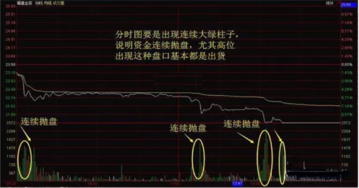 要是分时图连续出现大绿柱,股价也大跌,这种情况就是连续抛盘。要是高位个股早上出现这种情况,一定要注意,一般出现这种情况基本多半主力出货。 分时图成交量来看也是上涨缩量,下跌放量。